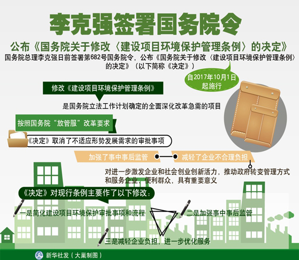 國(guó)務(wù)院總理李克強(qiáng)日前簽署第682號(hào)國(guó)務(wù)院令,公布《國(guó)務(wù)院關(guān)于修改〈建設(shè)項(xiàng)目環(huán)境保護(hù)管理?xiàng)l例〉的決定》(以下簡(jiǎn)稱(chēng)《決定》),自2017年10月1日起施行!