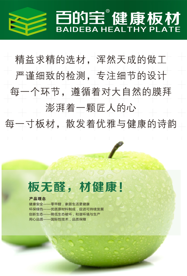 百的寶板材——如水果一般環保的家居健康板材:我們還會不斷的努力,努力的把環保做到極致,努力給消費者創造一個安全而又優雅的家居環境。