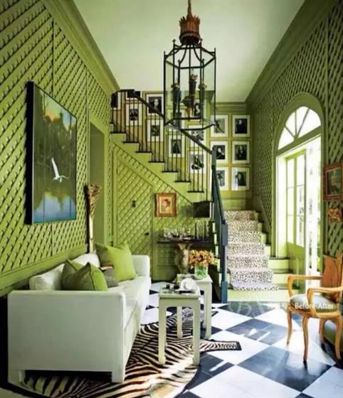 斑馬紋和菱格,難度系數10顆星,恰好分出廳與走道。但是注意看,連樓梯都是花的!層次鮮明,還不花眼,著實佩服!